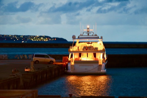 この見知らぬ船ですが、超超超豪華!!億単位の船らしいです。夜に見学に行ってきました。世の中にはお金持ちが沢山いるんですね~~~。