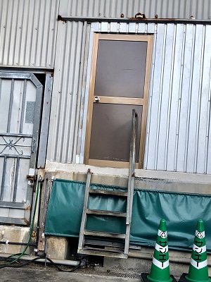 スーパーのバックヤードのドア。登るのにはチト高すぎるので取り付けられた階段は昔の飛行機のタラップを連想させる。