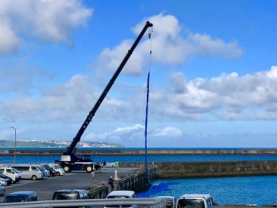 その時、目の前の桟橋ではのんきにパイナガマビーチのクラゲ除けネットをクレーンで水揚げしている光景が。そろそろ観光シーズンも終盤なのでしょうか。