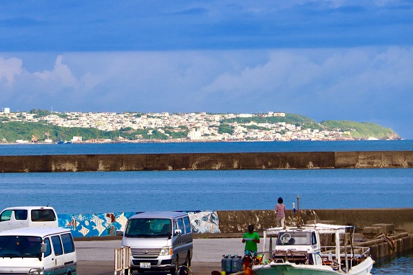 朝の陽ざしがあたる朝食時には、目の前の佐良浜の家々が真白けっけに見えます。