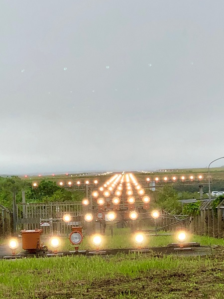 曇りプラス濃霧の日。いつも通りの道順で買い物に出かけた時のことです。まばゆい光を発見!!濃霧のために点けられた飛行機の誘導灯!!昼間に点いているのを初めて見ました。すごくきれい!!!!!しかも道路からすぐそこ!目の前です!!これが見られたのはかなりラッキーでした!!本当に、冴えない空のおかげですね。