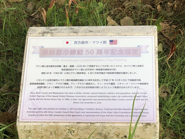 さらに、歩いたお陰で見つけたものがあった。宮古島市とマウイ郡は姉妹都市だったようだ。締結50周年記念植樹の石碑。