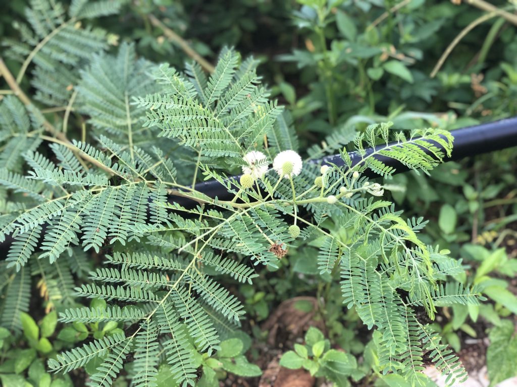 ギンネムの樹。中南米が原産だが、熱帯、亜熱帯の地方に世界中で見られる。日本では沖縄や小笠原など。可愛いらしい花を咲かせるが、恐ろしいほどの繁殖力で、宮古中どこでも生い茂っている。これが根付くと厄介なので、さすがに「しずかだん」には入らないように気を付けている。お墓掃除の時にその厄介さは経験済だから。
