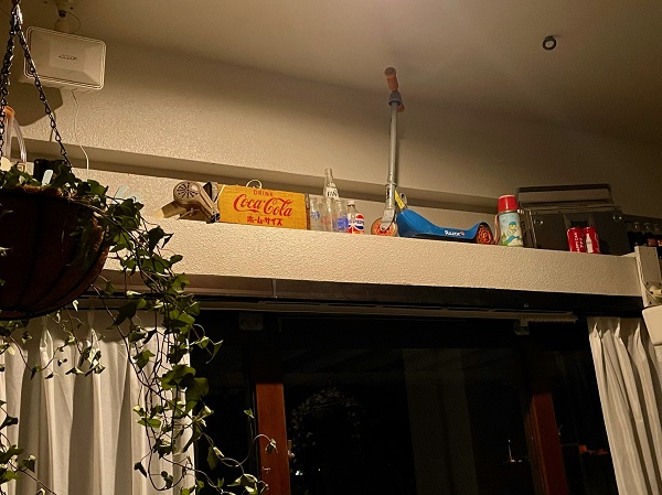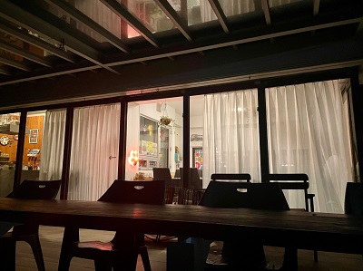 テラスにはパラソルで対策をしていましたが、今年は半屋内のスペースへ、冬のうちにカーテンをつけました。コンクリート造の建物を傷つけないようにレールをつける技を発明するのに2年かかりました。自己制作です。