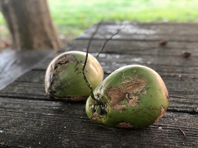 誰かが、拾った実をテーブルの上に置いていた。子供の顔くらいの大きさ。