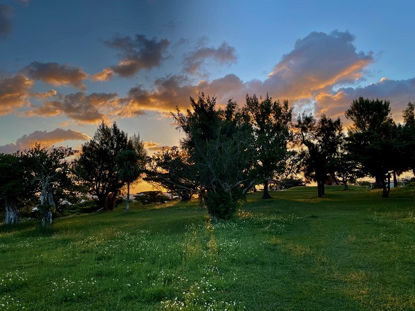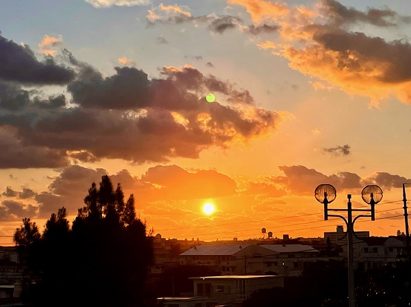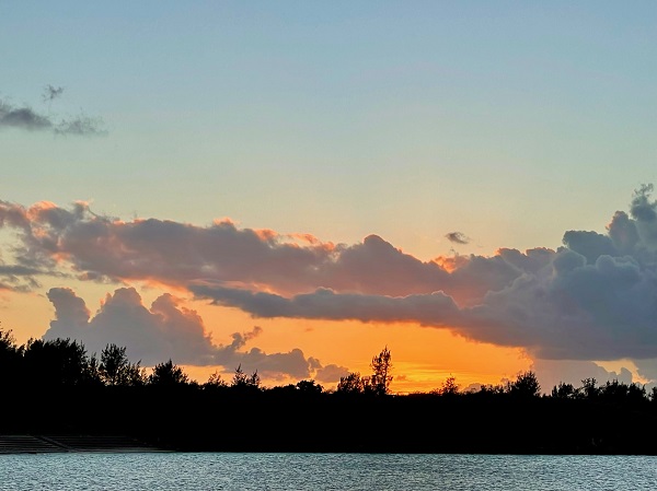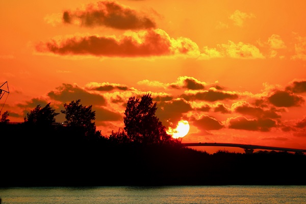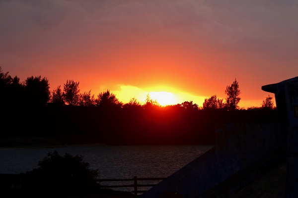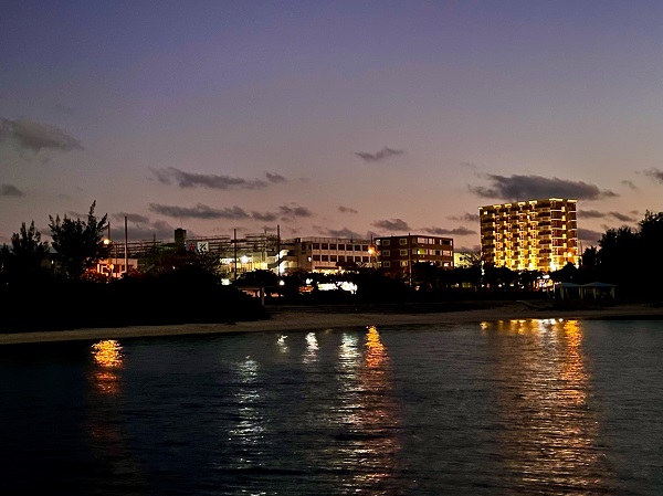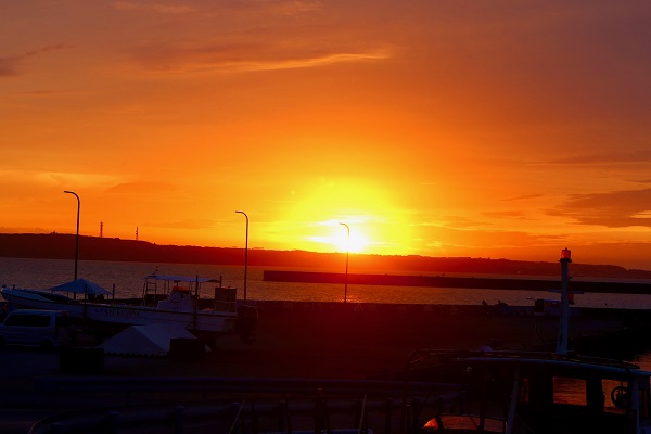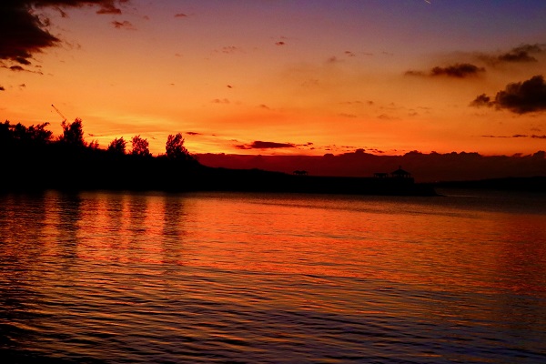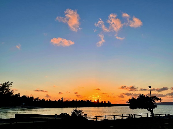 私は宿の前の桟橋から眺める夕日が好きです。ビーチも正面から一望できますから。